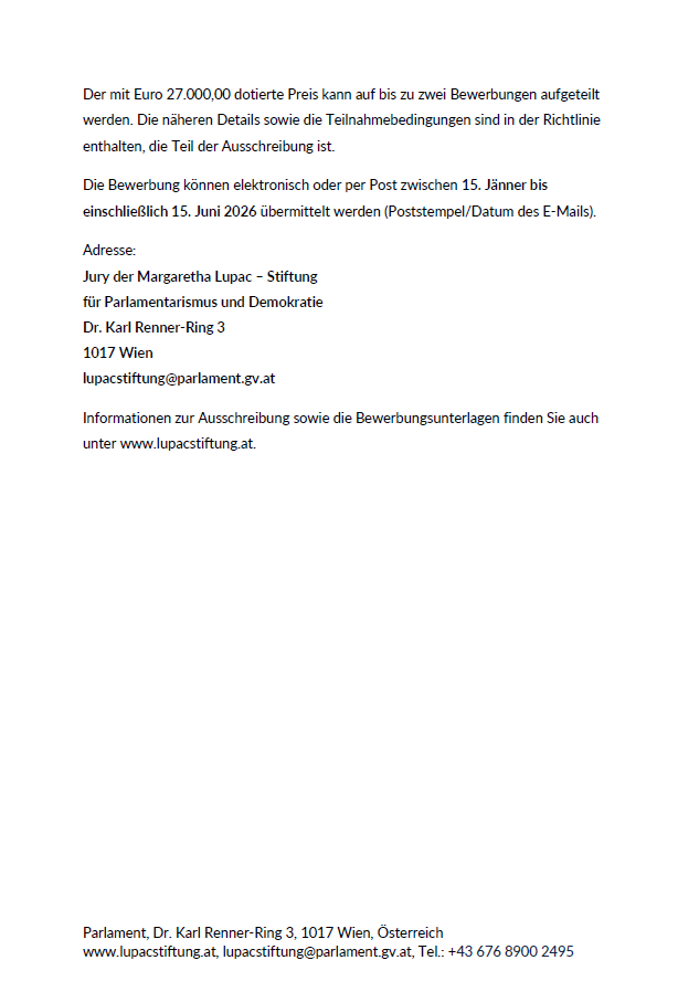 Adresse: Jury der Margaretha Lupac – Stiftung für Parlamentarismus und Demokratie, Dr. Karl Renner-Ring 3, 1017 Wien, E-Mail: lupacstiftung@parlament.gv.at