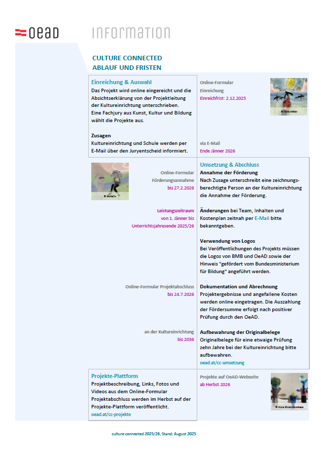 - Einreichen können: Kultureinrichtungen, -initiativen und -vereine in Zusammenarbeit mit österreichischen Schulen mit Öffentlichkeitsrecht und Projektteams der schulischen Tagesbetreuung