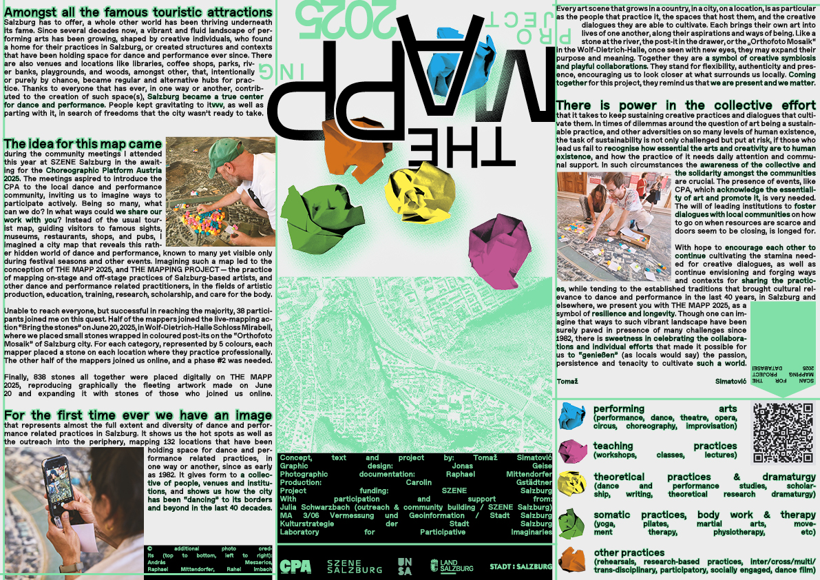 THE MAPP 2025 - represents almost the full extent and diversity of dance and performance related practices in Salzburg. It shows us the hot spots as well as the outreach into the periphery, mapping 134 locations that have been holding space for dance and performance related practices since as early as 1982. It gives form to a collective of people, venues and institutions, and shows us how the city has been “dancing” to its borders and beyond in the last 40 decades.